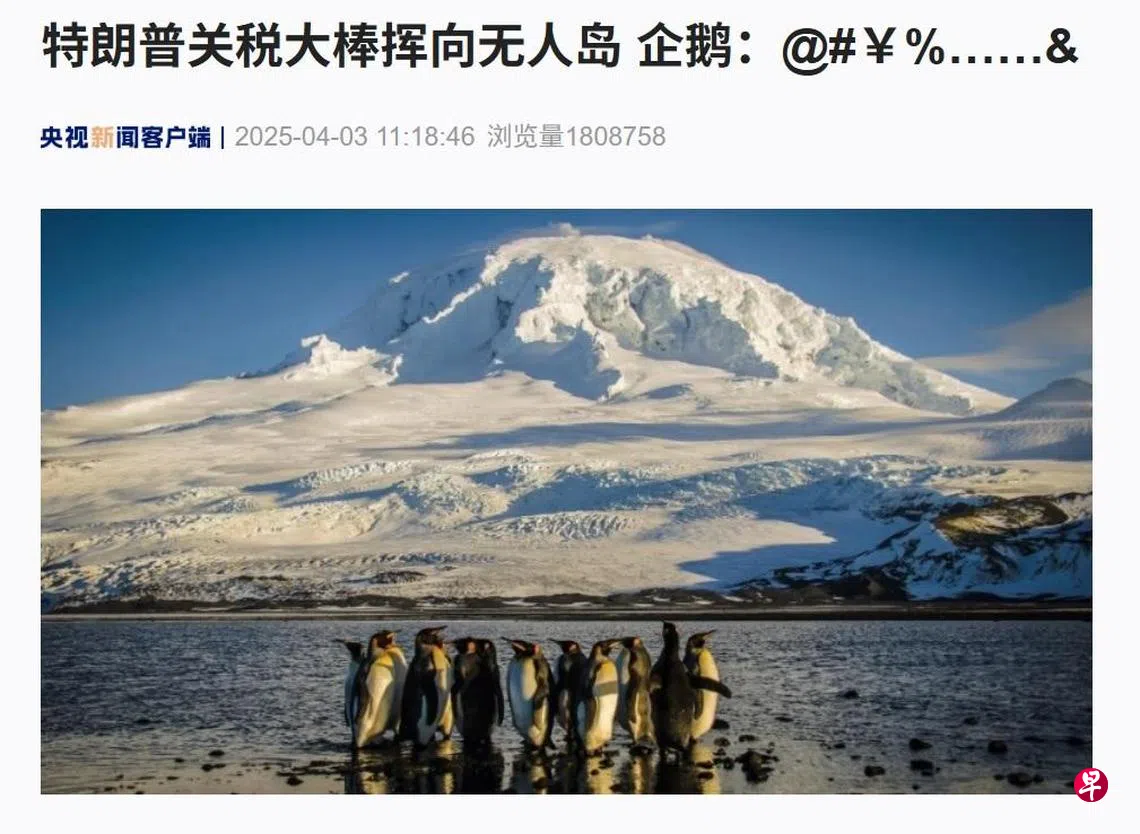 央视以“特朗普关税大棒挥向无人岛 企鹅:@#¥%……&”为标题,报道了美国会对赫德和麦克唐纳群岛征税的新闻。