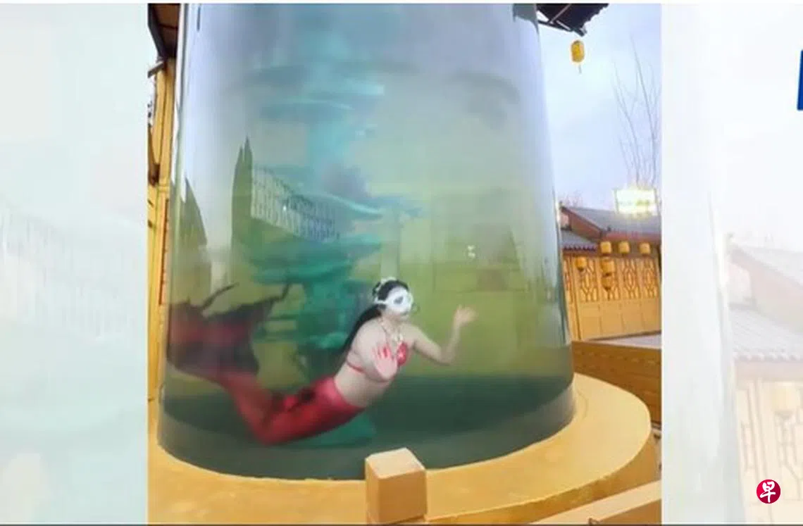 据极目新闻报道,多位网民上星期六(4月5日)发出视频,显示辽宁盘锦市大洼区黑风关古镇内,一提供美人鱼表演的大型水缸内储水混浊不堪,已经变绿。网民质疑水质会影响女演员健康。