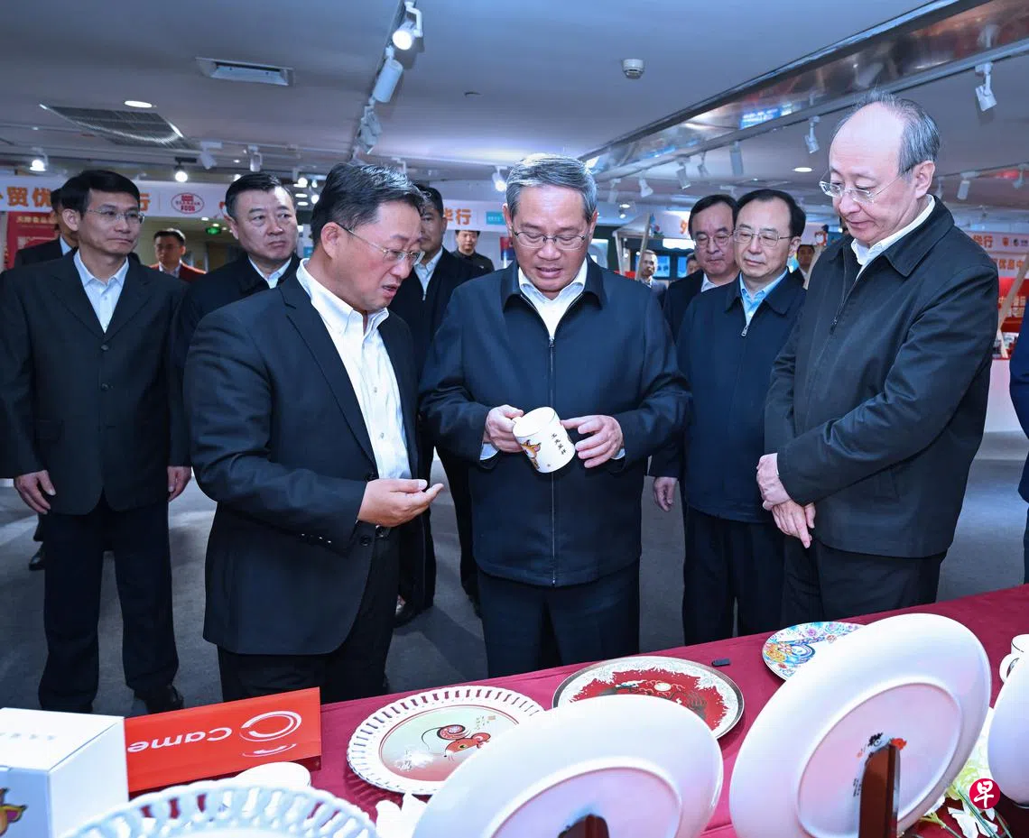 李强在西单大悦城走进纺织品、轻工产品、食品等展销区,与参展企业负责人和销售人员交流,了解产品出口及内销情况。