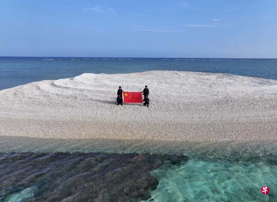 中国官媒称,中国海警本月中旬登上南中国海的铁线礁(Sandy Cay),并展示五星红旗。