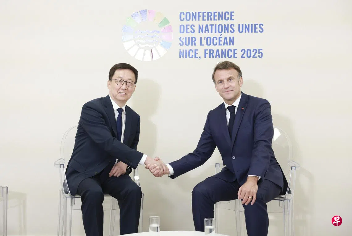中国国家副主席韩正当地时间星期一(6月9日)在法国尼斯出席联合国海洋大会期间会见法国总统马克龙,表示北京支持巴黎坚持战略自主,愿同法国加强双多边战略沟通协作,为中法关系发展注入新动力。