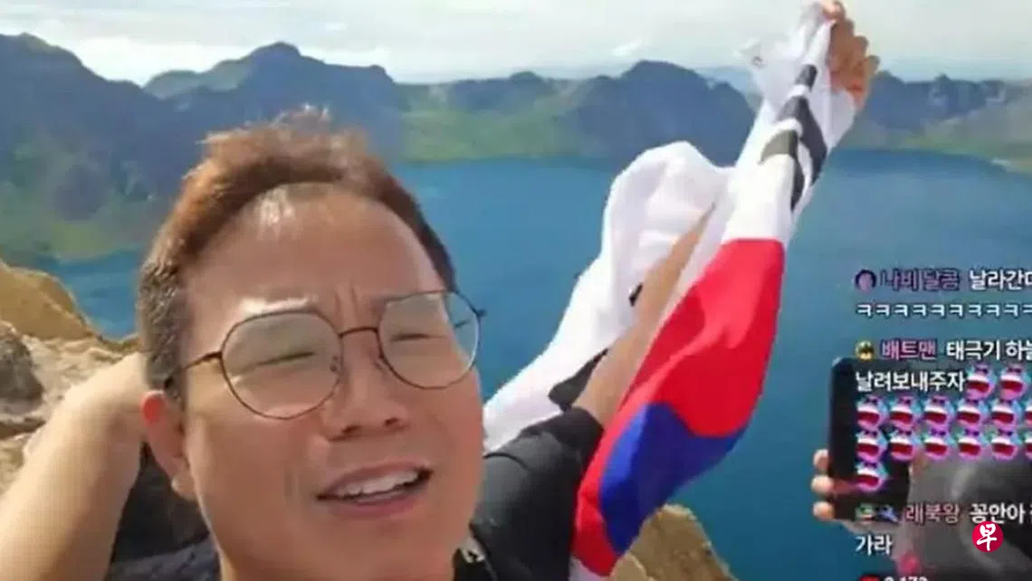 画面显示他在游览长白山天池时,从背包取出韩国国旗挥舞,并高唱韩国国歌,随即被一旁的工作人员冲上前抢走国旗。