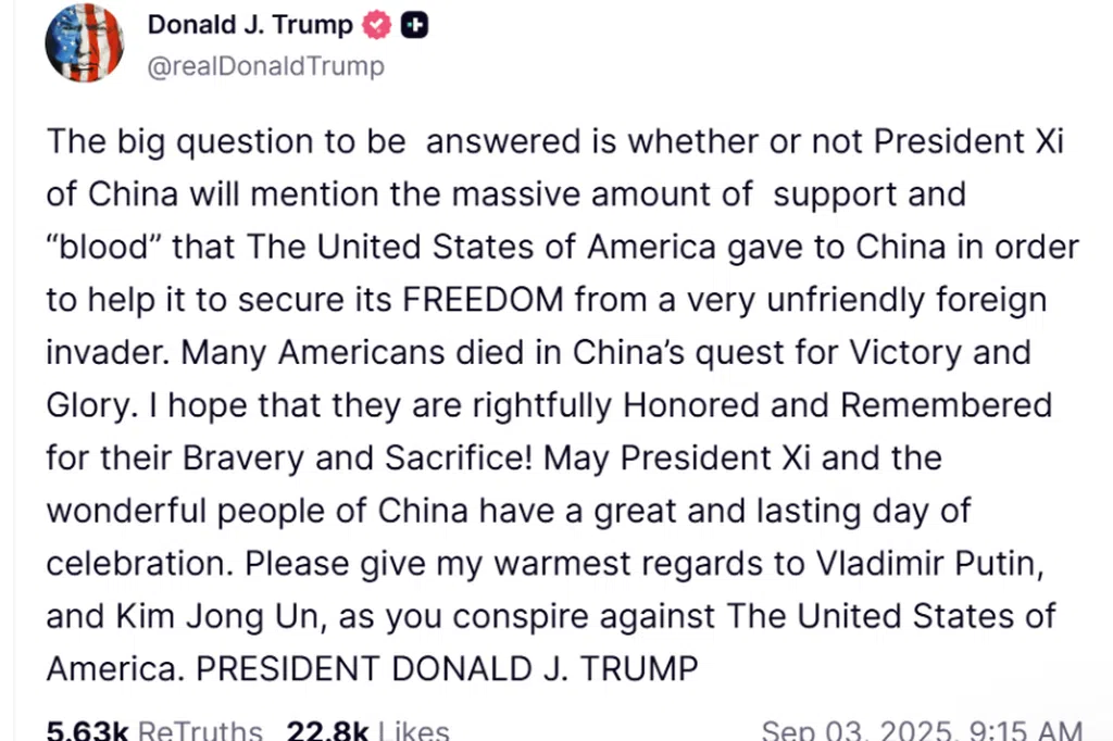 特朗普在九三阅兵开始前几个小时,在白宫椭圆形办公室向记者说:“正如你们所知,我和习近平主席关系很好……但中国对我们的需要远胜于我们对他们的需要。”