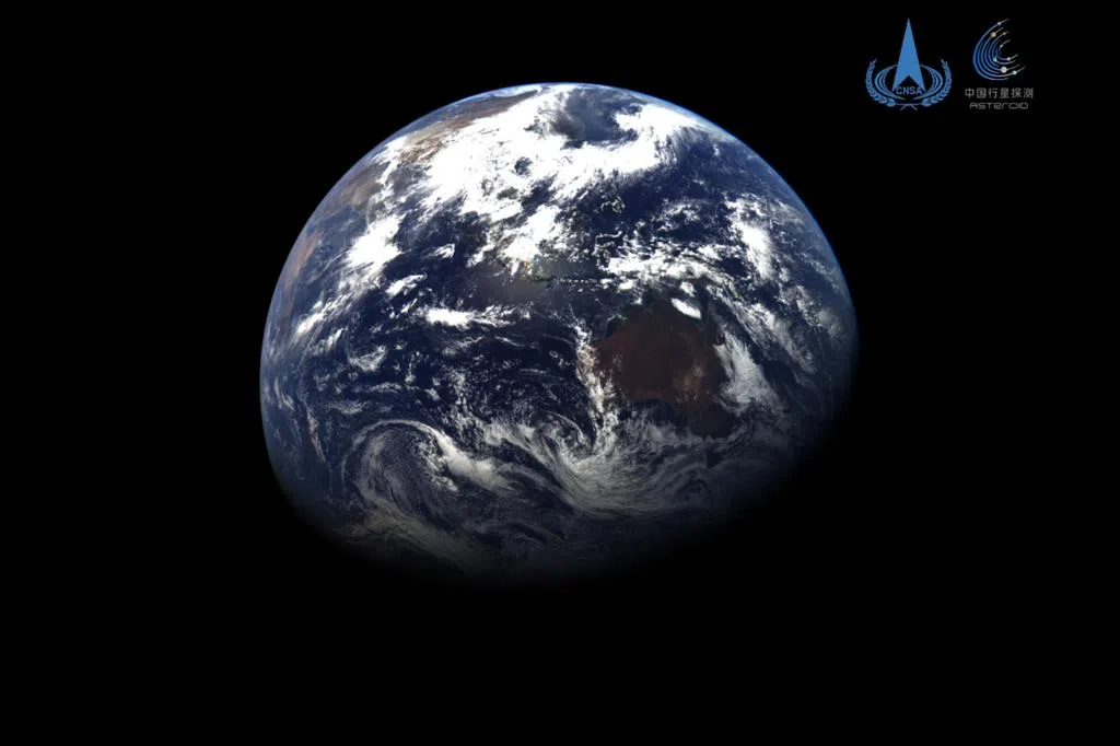 中国国家航天局星期三(10月1日)发布行星探测工程天问二号任务探测器在轨飞行期间,获取的探测器与地球合影图像。