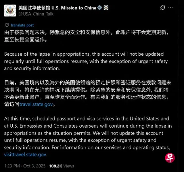 美国驻华使馆星期五(10月3日)在X平台发文称,由于拨款问题未决,除紧急的安全和安保信息外,此账户将不会定期更新,直至恢复全面运作。
