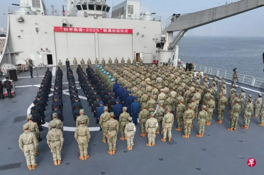 “和平友谊—2025”联合演习的中方参演部队星期三上午分别从湛江、三亚、香港三地军港出征,通过海上输送方式前往马来西亚。