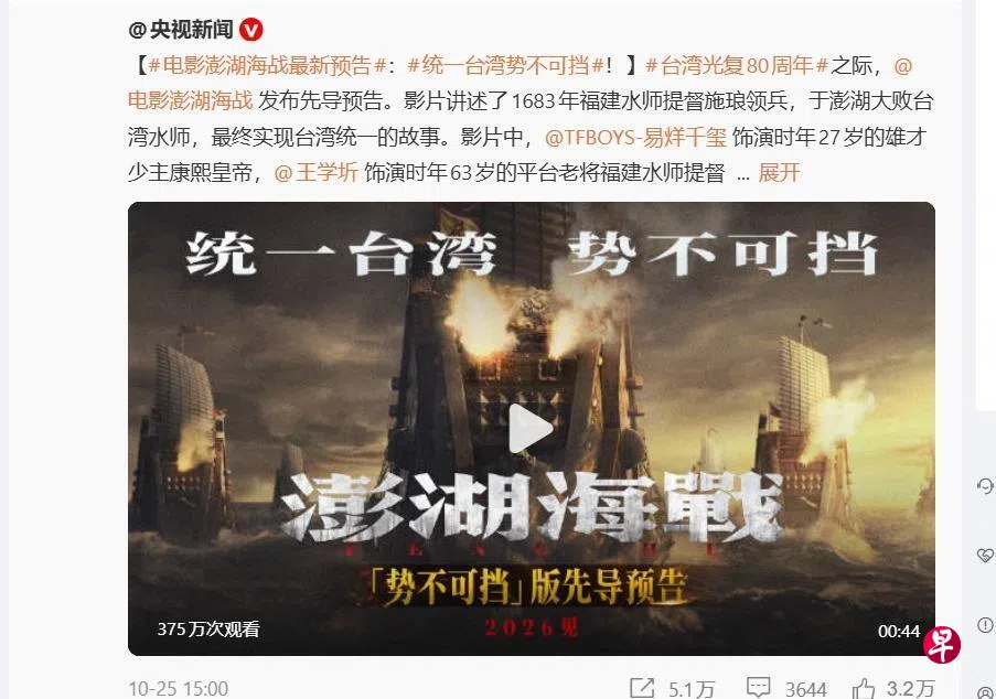 中国中央电视台在上周六(10月25日)台湾光复80周年当天,公布将在2026上映的电影《澎湖海战》首支预告片。这部影片被视为中国大陆继谍战电视剧《沉默的荣耀》之后,又一部针对台湾心理战的影视作品。