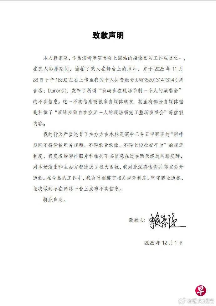 这名赖姓男子的全名为赖宗隆,他星期一(12月1日)下午通过微博账号“烟火濒海”发布了致歉声明。他首先写道,作为滨崎步演唱会上海站的摄像团队工作成员之一,在艺人彩排期间,偷拍了艺人在舞台上的照片,并于上星期五(11月28日)下午6时左右上传至个人抖音账号。
