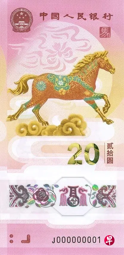纪念钞正面主景为马的造型图案,上方为中华人民共和国国徽、“中国人民银行”、篆书“马”字印章,下方依次为光彩光变面额数字“20”与汉字“贰拾圆”、动感全息图案、透明视窗、盲文面额标记和冠字号码。