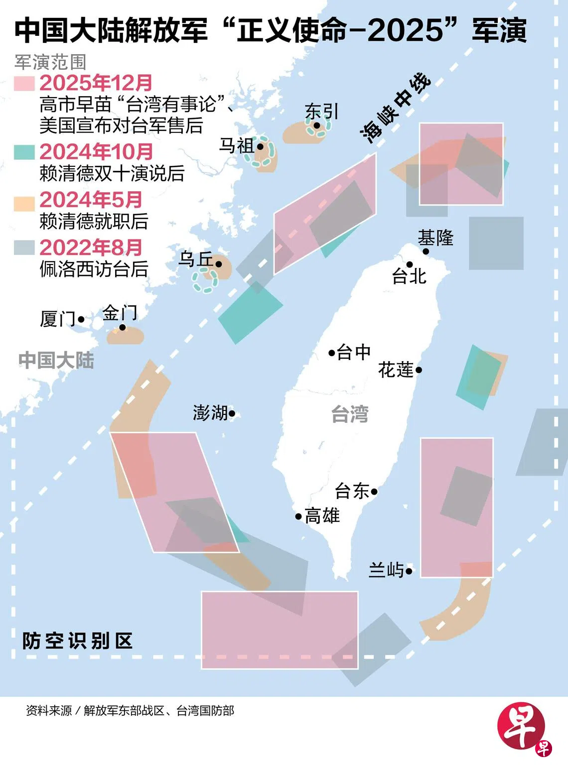 据解放军东部战区微信公众号发布的消息,东部战区新闻发言人施毅陆军大校表示,东部战区星期一开始组织陆军、海军、空军、火箭军等兵力,在台湾海峡,以及台湾本岛的北部、西南、东南、以东,组织“正义使命-2025”演习。