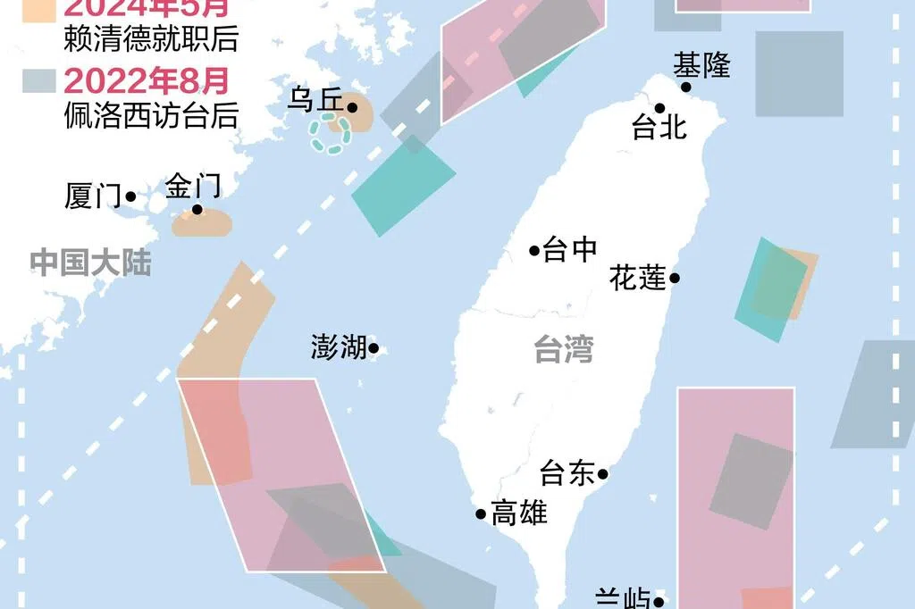 就操演范围而言,这次解放军划设五个操演区,最接近台湾的一处,位于恒春半岛南方,北缘纬度是21度49分,已贴近台湾领海基线的边缘。不过2022年围台军演时,在台湾北部与西南部海域,也曾有类似状况。