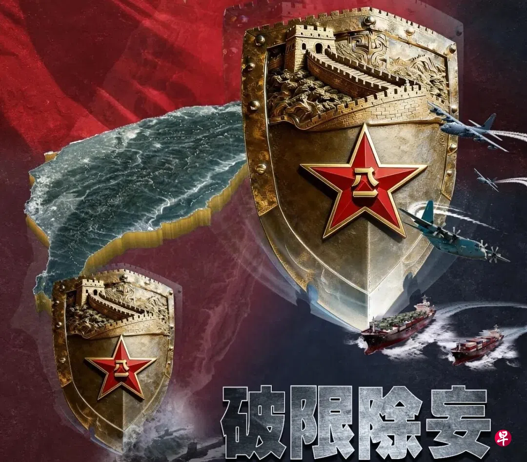 东部战区实施围台军演之际,星期一也发布军事演习主题海报《正义之盾 破限除妄》。栗正杰分析,海报上的两个盾牌分别放置在台湾本岛的北部和南部,明显旨在挡住外来攻击。