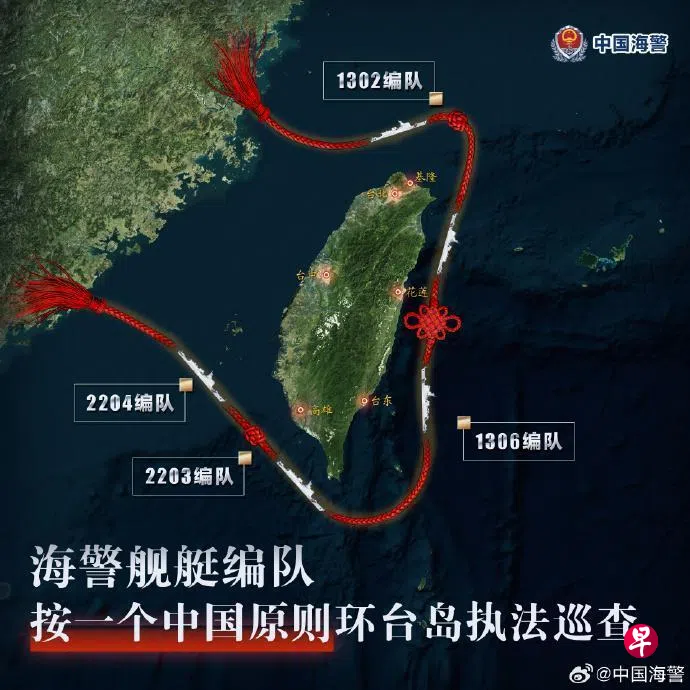 大陆海警在微博发布的示意图显示,台湾周边有四个大陆海警编队参与巡查,其中1302编队在台湾北部基隆岸外海域,1306编队在台东附近的海域,2203编队在台湾南部高雄岸外海域,2204编队则在台湾西南部岸外海域。