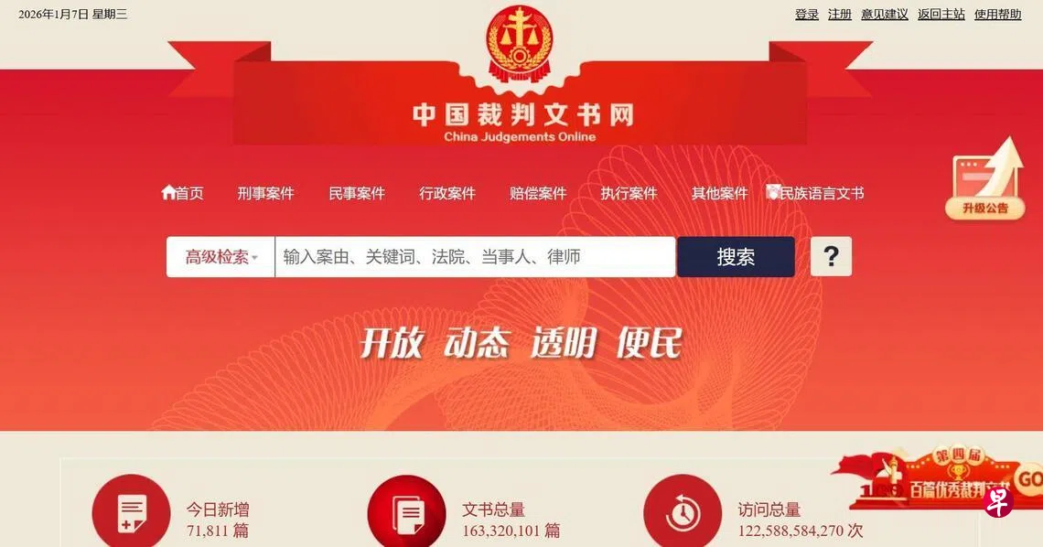 2013年上线的中国裁判文书网,是中国各地法院的统一裁判文书公开平台,截至星期三(1月7日)已累计对外公开逾1.6亿份生效裁判文书。
