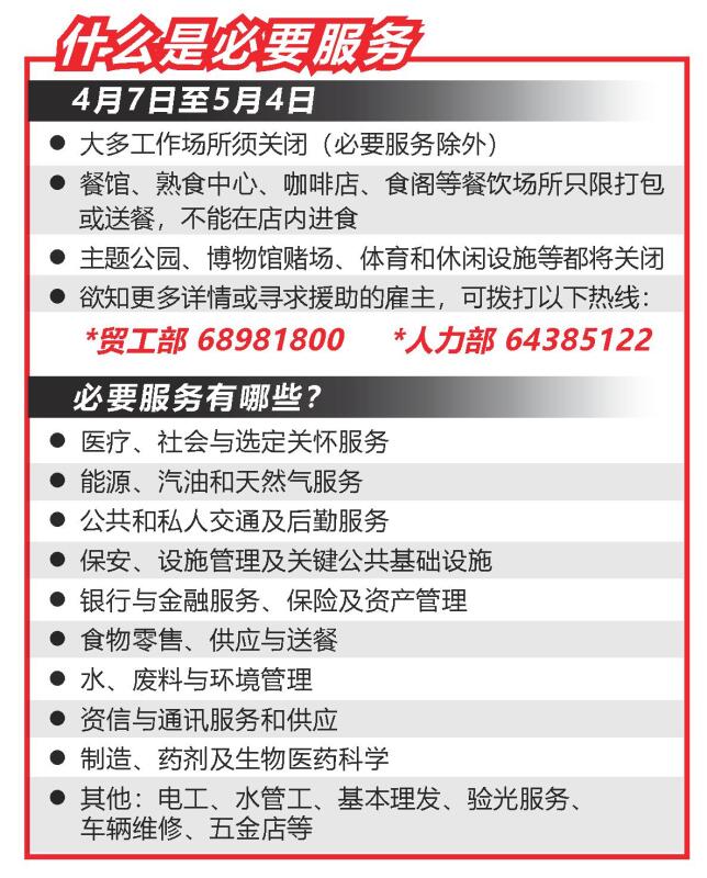 (早报讯)必要服务如医疗、社会服务、金融服务等将继续营业,一些指定服务如理发店(只能剪发不能烫发)、洗衣店和电梯维修等照常。本地银行会限制开放的分行数量。所有景点、主题公园、博物馆和赌场等将关闭。