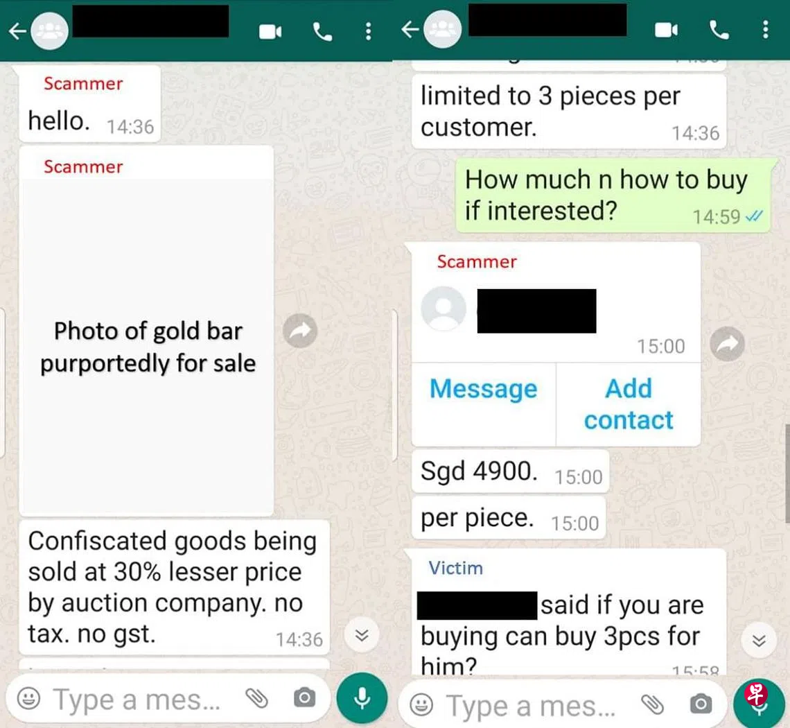 新加坡警察部队发文告表示,在这类案件中,骗徒先盗用受害者朋友的WhatsApp户头,并用该户头跟受害者沟通,询问对方是否有意购买金条。骗徒解释这些金条的价格低于市场价三成,主要是因为出售的金条是来自新加坡关税局以及移民与关卡局充公后获拍卖所得。