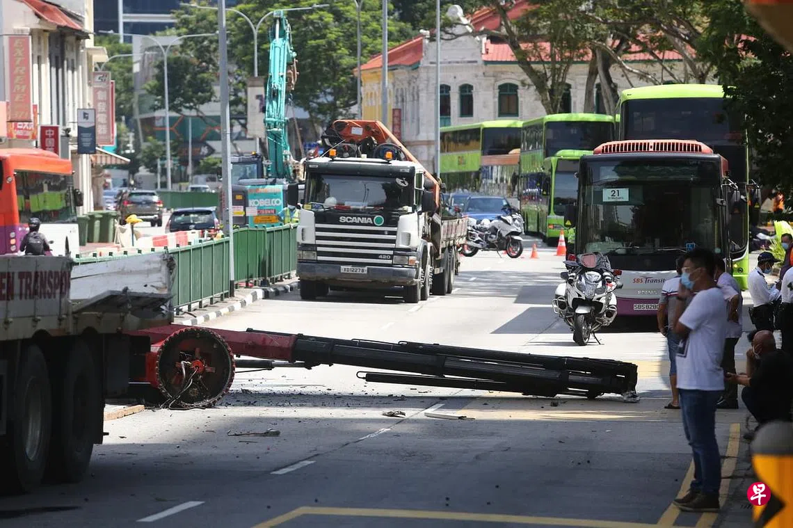 涉事的罗厘则停在起重吊臂前不远处,后方几辆巴士也受影响停在一边,巴士上的乘客都已被疏散,整个区域被当局人员放置安全锥封锁。