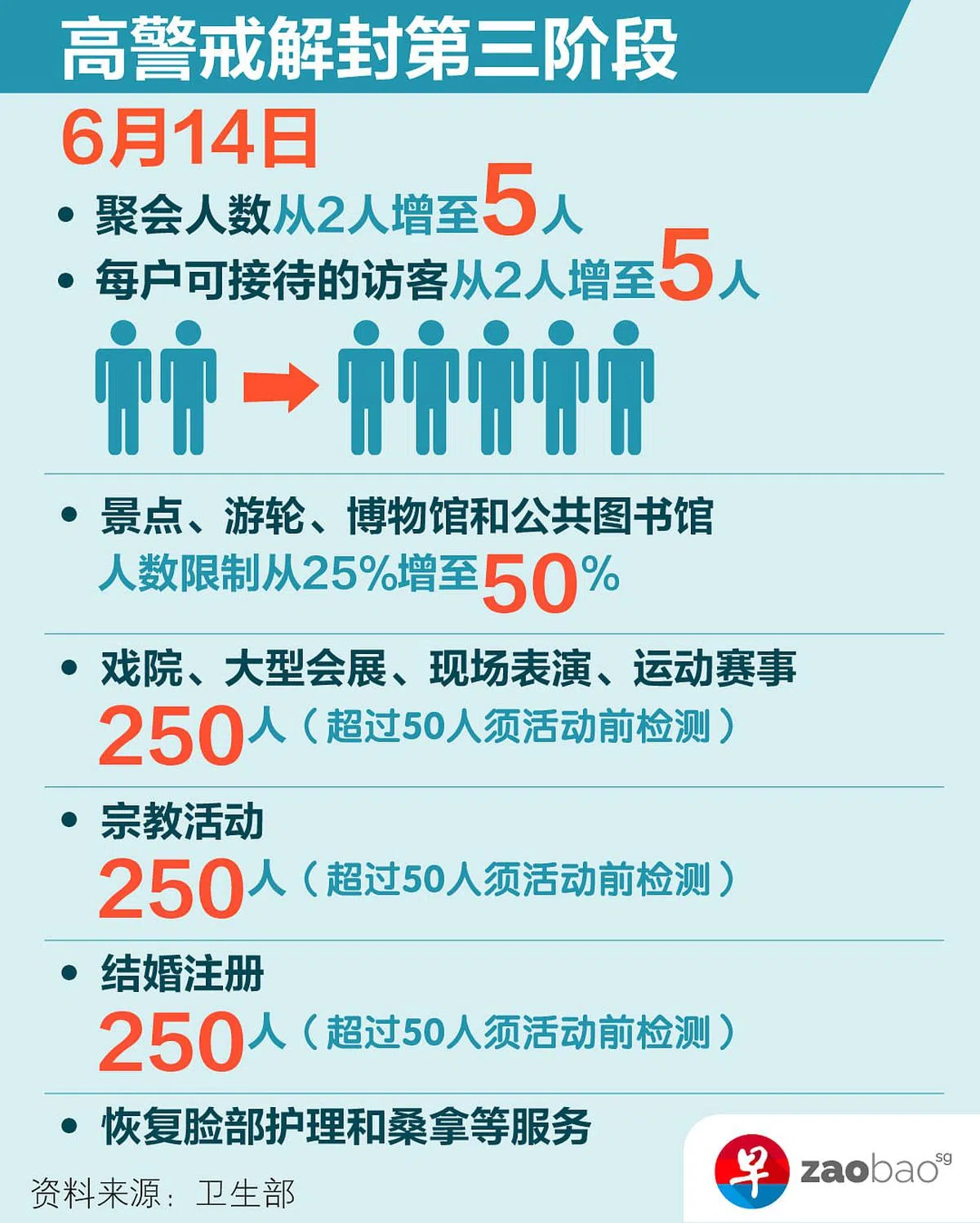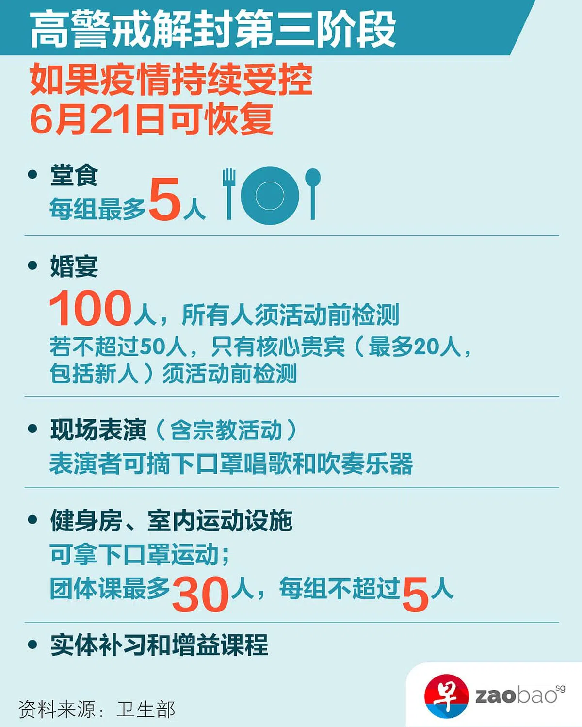 (早报讯)我国将逐步重返高警戒解封第三阶段。下周一(6月14日)起,社交聚会和登门访客人数将从最多两人增至五人。若疫情局势持续受控,本月21日起也将恢复更多风险较高的活动,包括堂食。