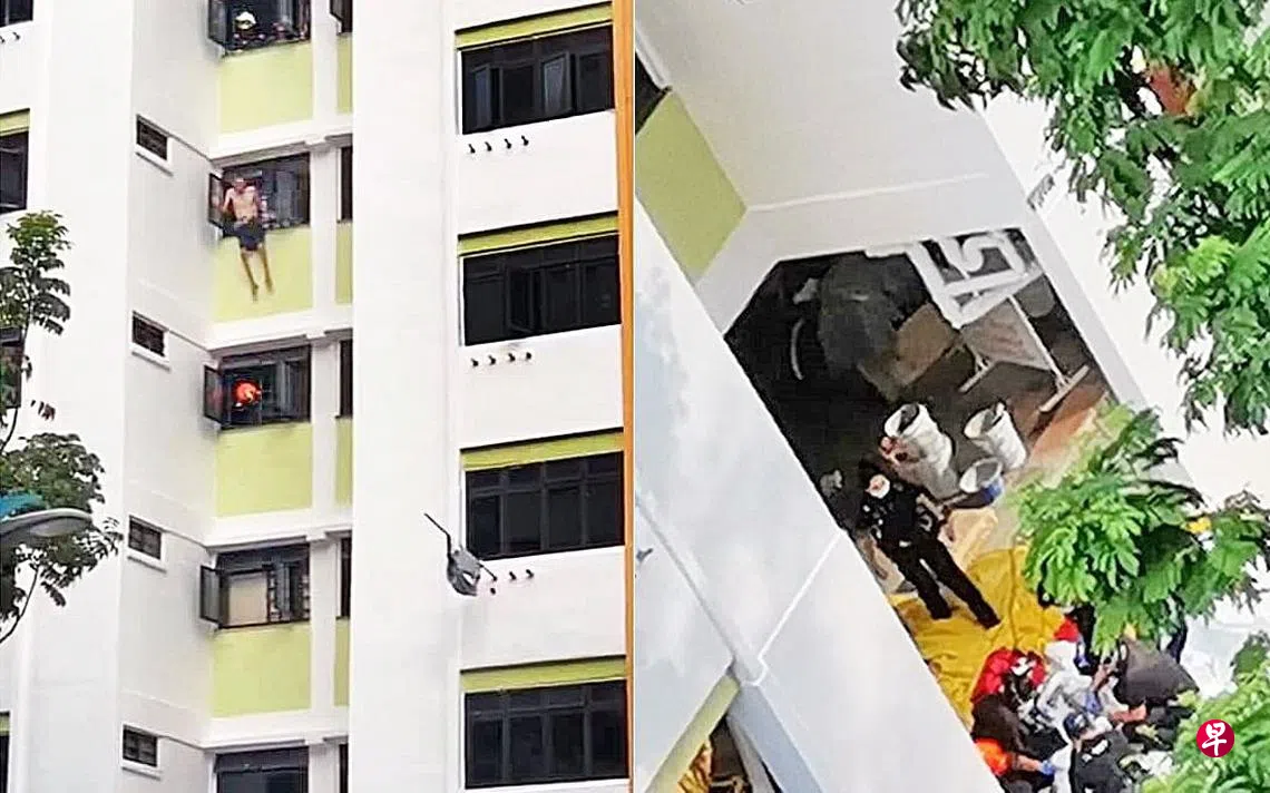 (早报讯)独居拐杖伯危坐6楼窗沿逾20分钟后,一跃而下,所幸落在安全气垫下,受伤送院。