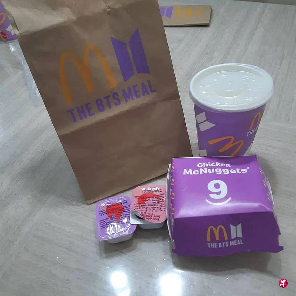 (早报讯)防弹少年团(BTS)与麦当劳的联名套餐将在下个星期一推出,不过,本地的粉丝们只能通过送餐外卖平台订购,无法直接从麦当劳快餐店或得来速(Drive-Thru)购买。