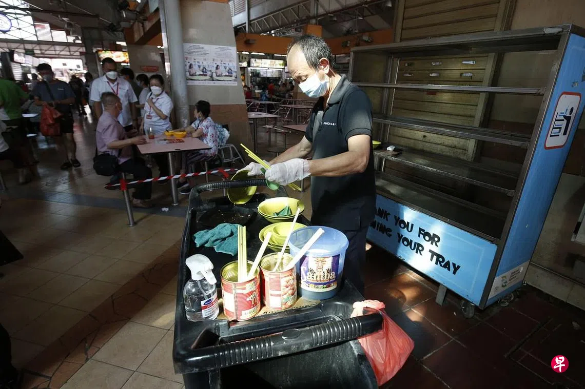 (早报讯)今天(6月21日)除了恢复堂食,也是国家环境局强制食客在小贩中心用餐后归还托盘和餐具的第一天,小贩中心不乏大使提醒公众防疫措施,以及在用餐后清理桌面。
