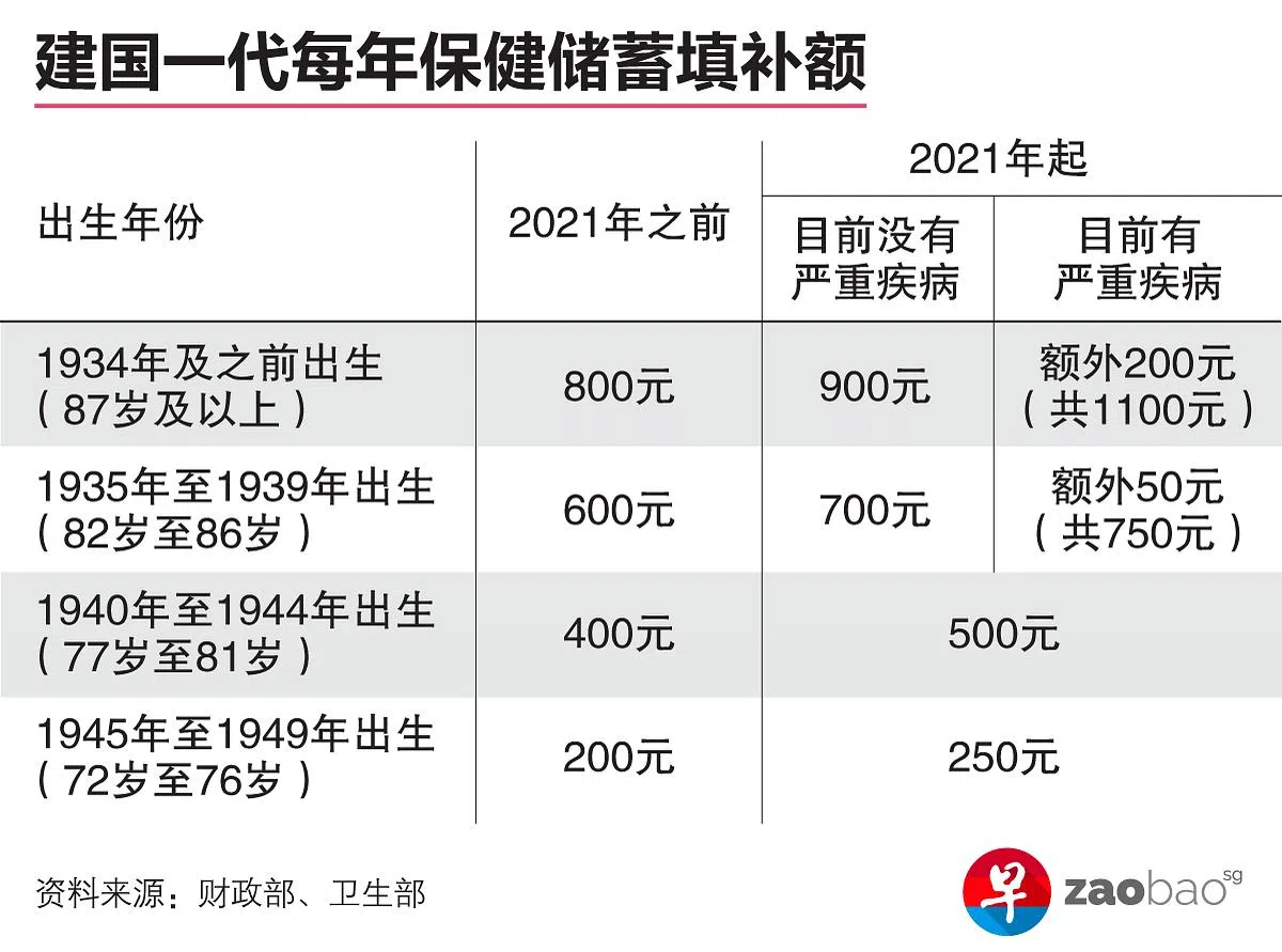 卫生部去年12月宣布,从今年起,建国一代年长者每年的保健储蓄填补额会增加,从200元至800元增加到250元至900元不等。这项填补终身有效。