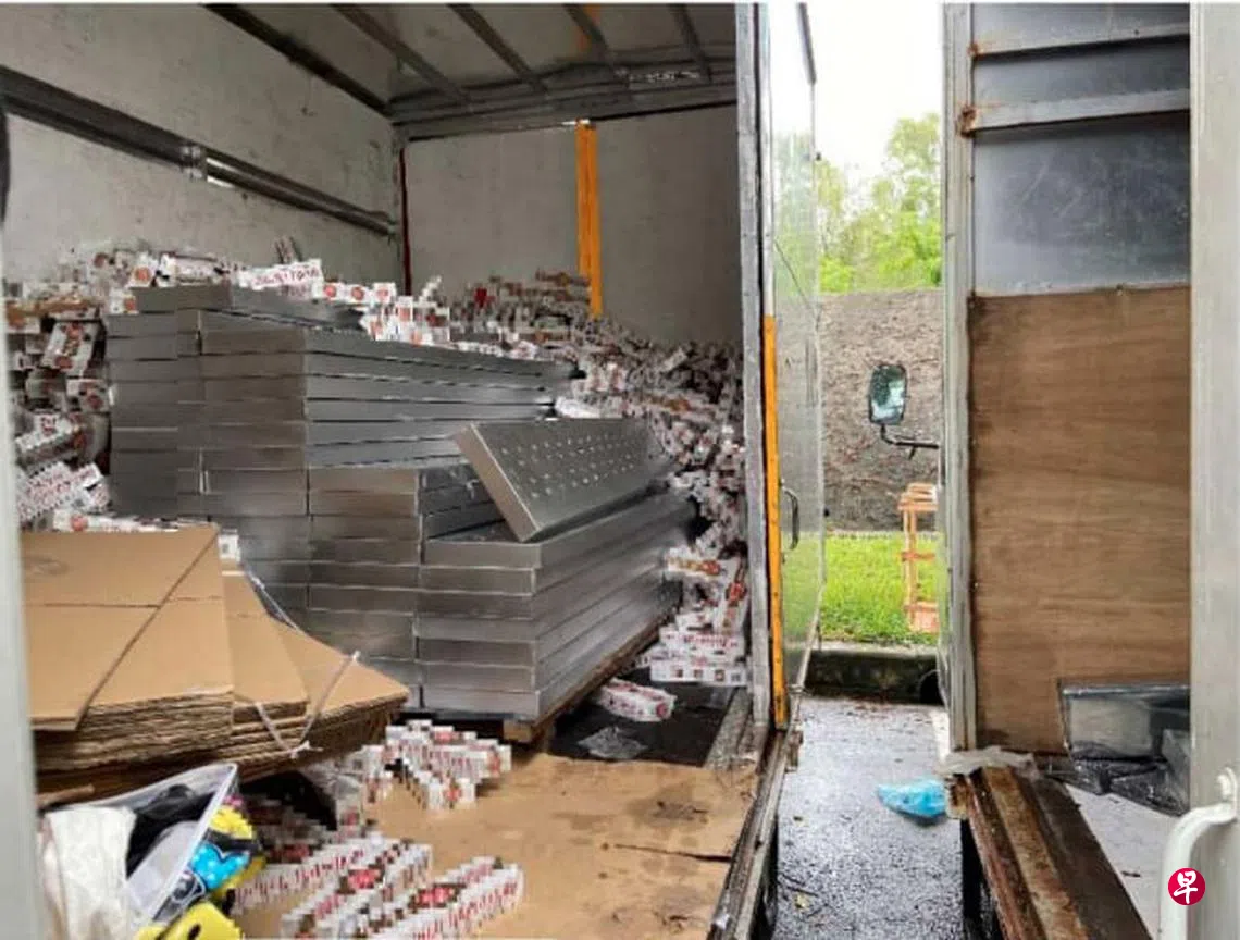 (早报讯)四名男子在义顺停车场内忙前忙后,从两辆货车上来回搬运金属条,直到关税局人员向前搜查,打开所谓“金属条”里面竟铺满一盒盒漏税烟,四名男子当场被捕。