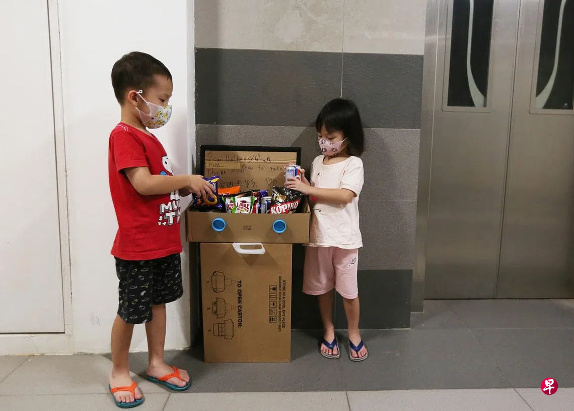 (早报讯)爱心无距离,行善不分年龄!宏茂桥一家大小五口人,在组屋的电梯旁设立“下午茶”角落,饮料零食让送餐员免费自取。此举起了抛砖引玉的作用,深受感动的邻居,如今也会主动到小角落填补零食。