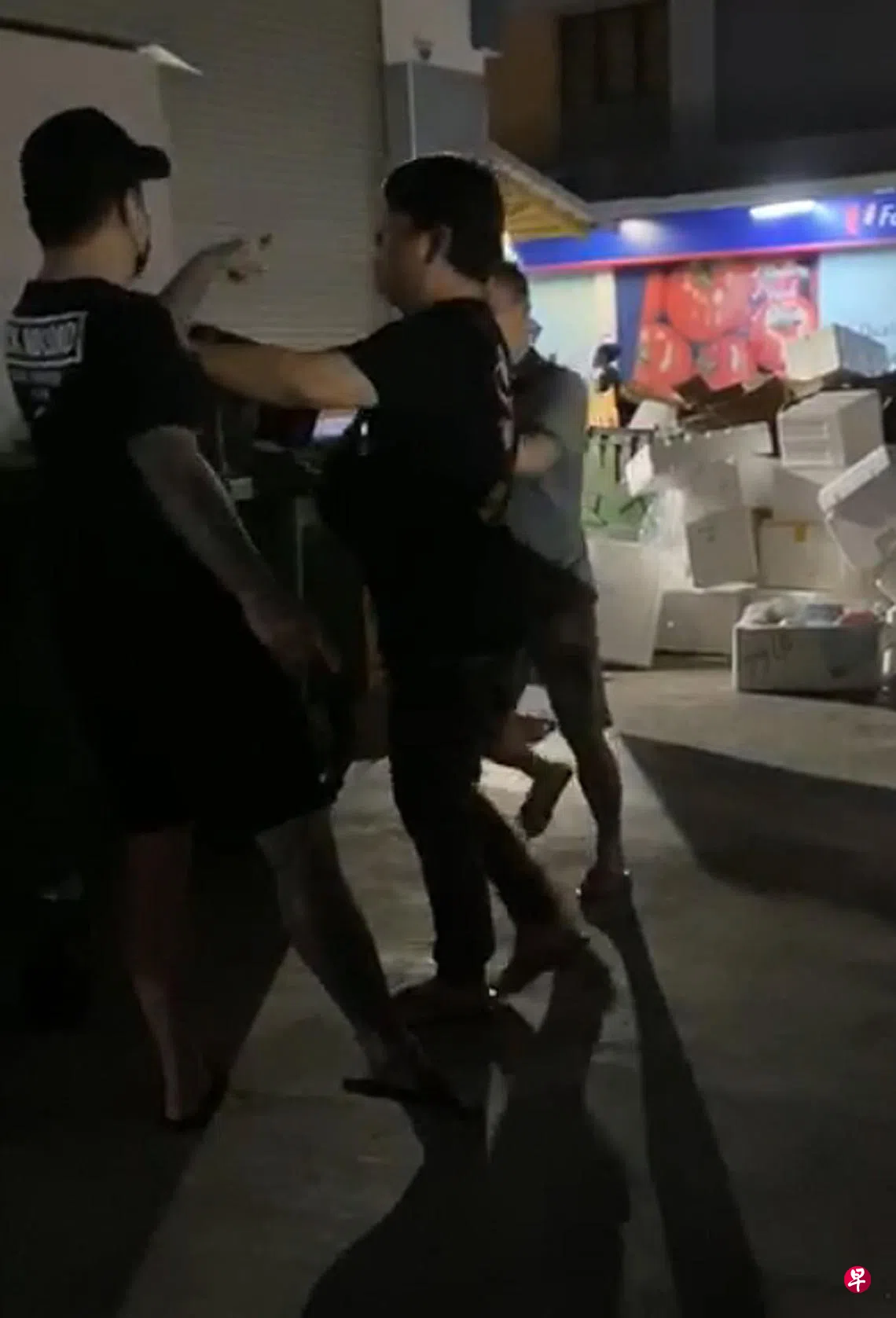 (早报讯)瞪眼起风波,夫妇到小贩中心吃宵夜,丈夫被指瞪眼,结果与两男大打出手,丈夫把其中一名男子的鼻子打断后离开,男子原本要追击,回头瞧见对方的妻子正在拍视频,转而对她下手,将她一拳打倒在地后还补了一脚。