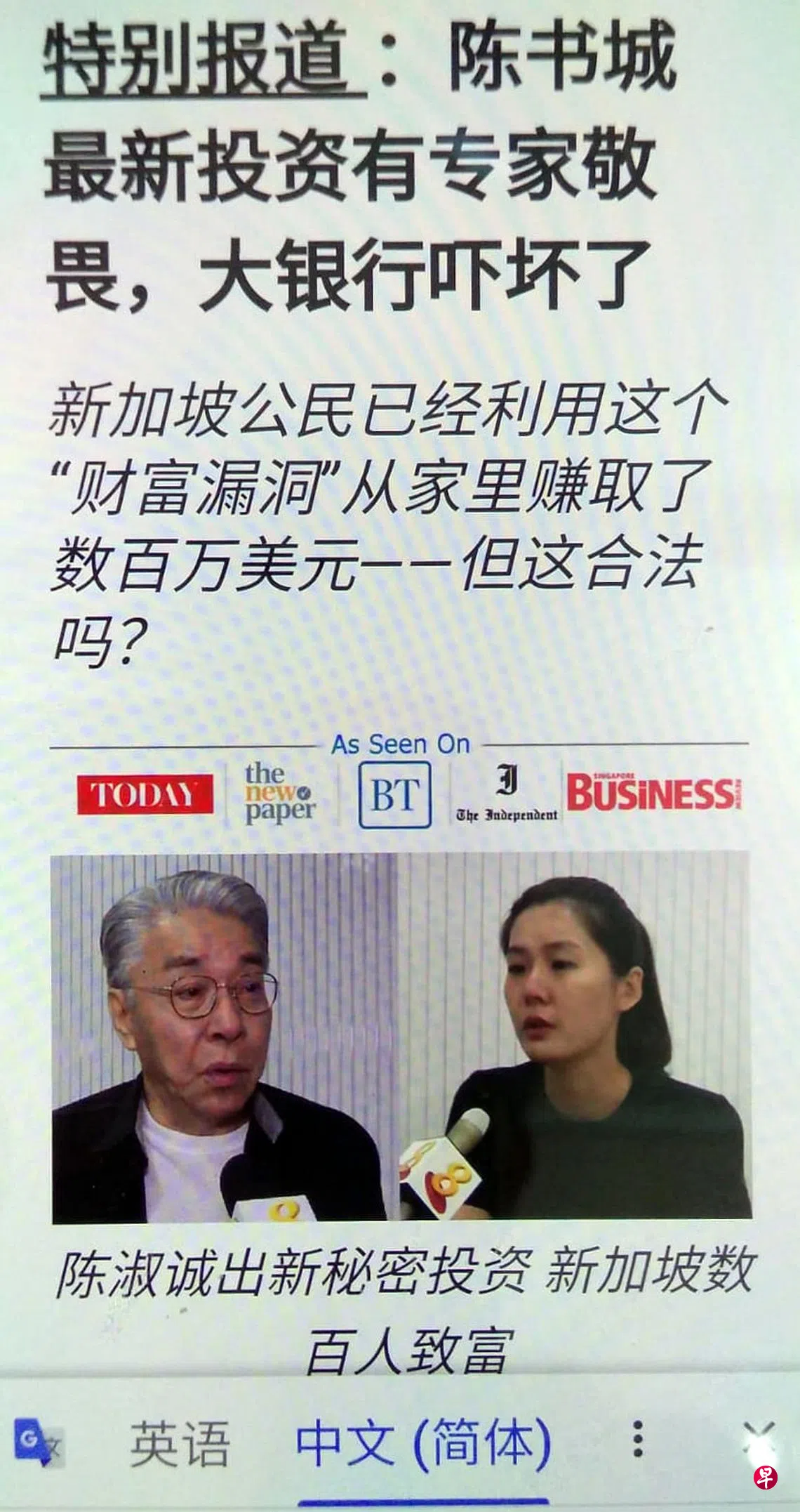 根据她提供的网页截图中,可见到陈澍城的头像,内容称能用“财富漏洞”来赚取数百万美元。不过,截图中的内容,将陈澍城的名字误植为“陈淑诚”,标题的语句也不通,让人看得一头雾水。