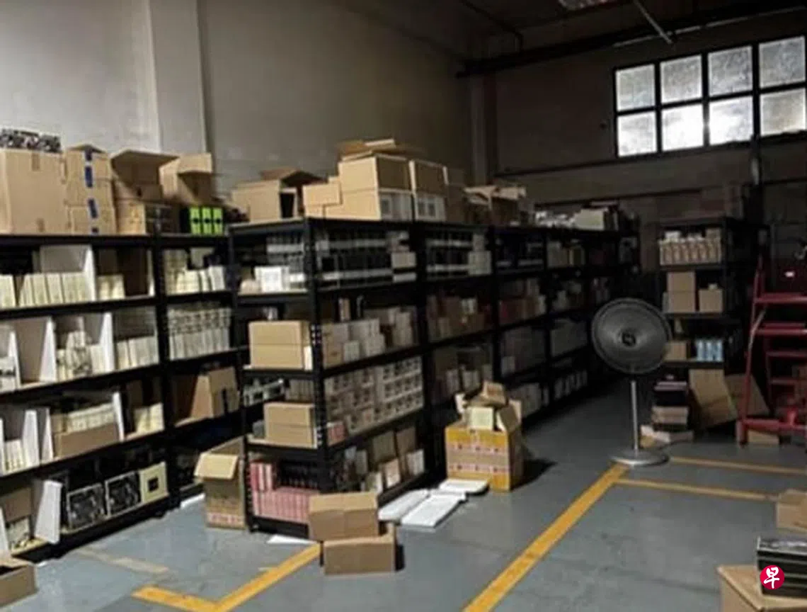 警方提供的照片显示,被扫荡的货仓摆着至少三排架子,这些架子上摆满了各式各类的商品,以及大大小小的纸皮箱。货仓里的小桌子也放有多瓶香水以及一些化妆品。