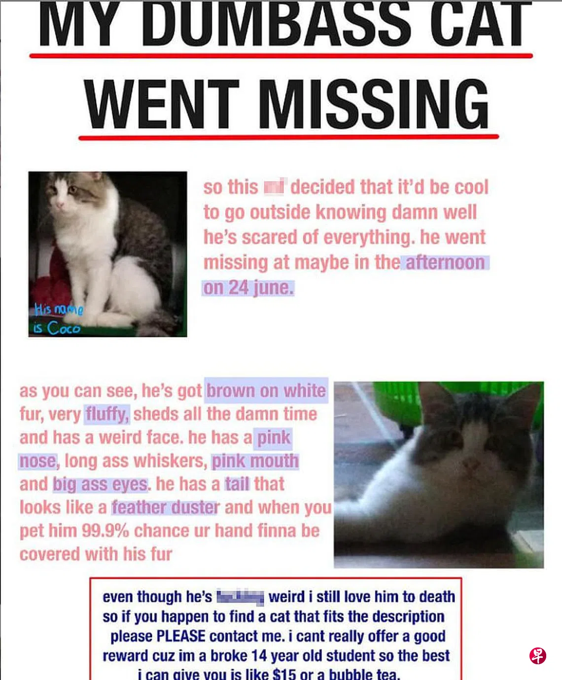一名14岁少女上周在社交媒体贴文,指爱猫“Coco”在6月24日下午,在兀兰83街第865座组屋一带不见踪影,请求网友帮忙寻猫。