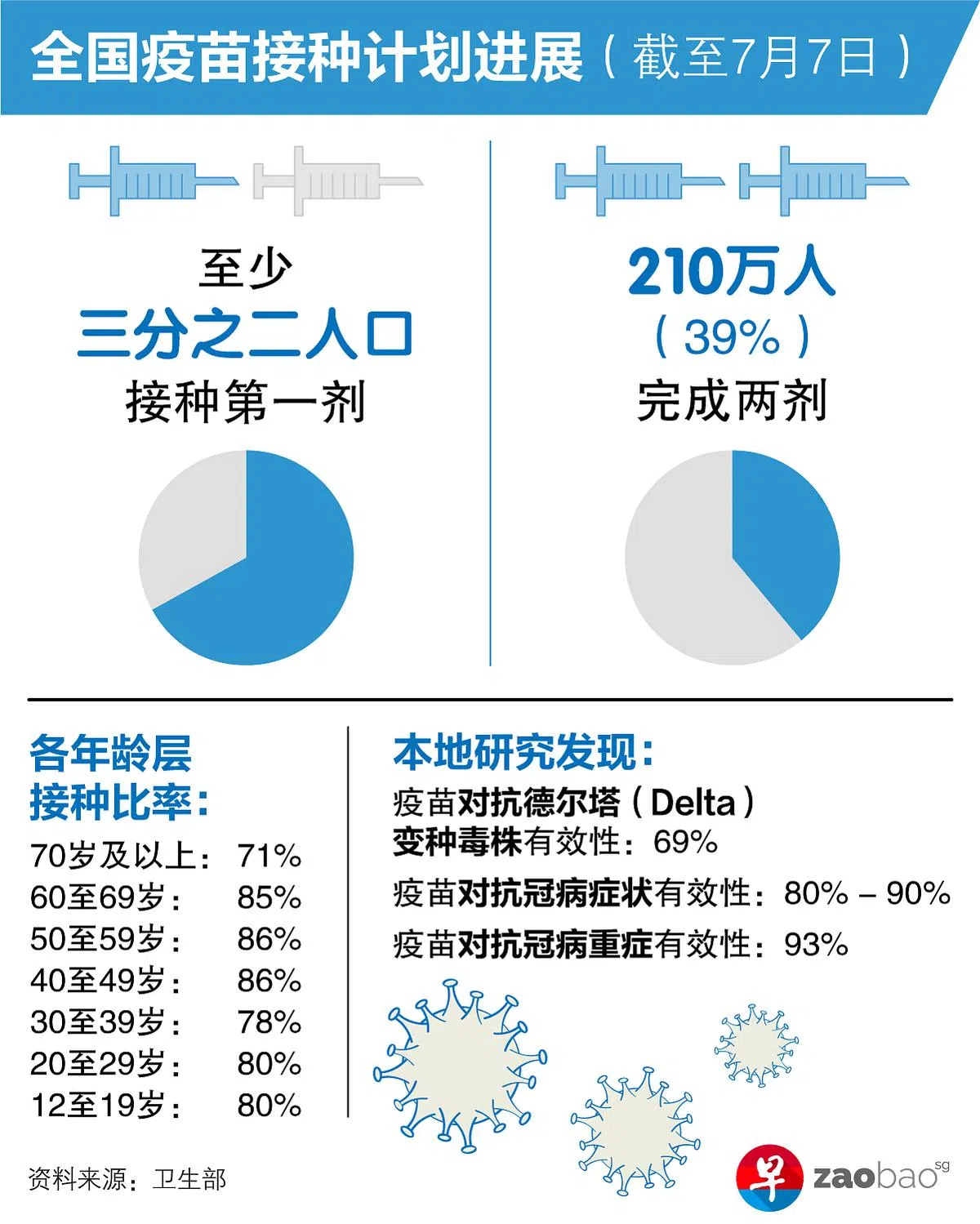 今天结束后,我国估计会有三分之二人口已完成至少一剂的冠病疫苗的接种。截至目前,本地已有近四成人口,相等于210万人接种了两剂冠病疫苗。