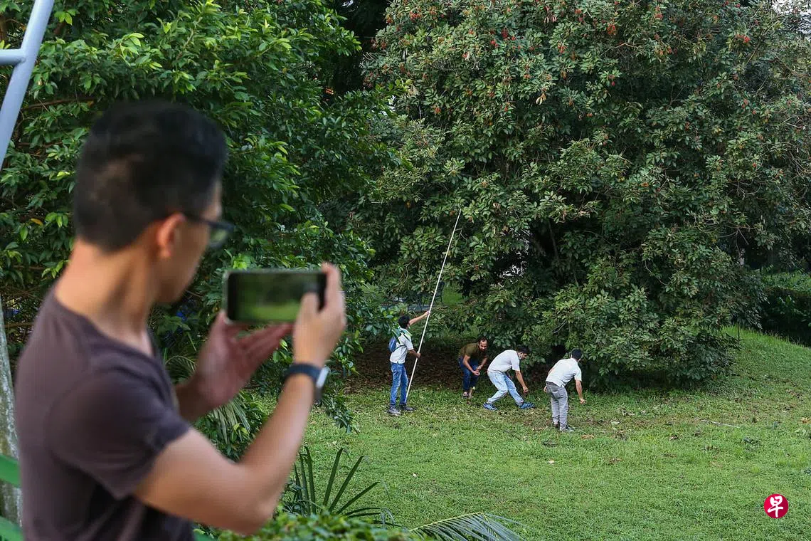昨天傍晚6时30分,金文泰14街第101座组屋旁,四名男子站在红毛丹树下,合力挥动长棍,尝试把高挂树上、红彤彤的红毛丹打下来。