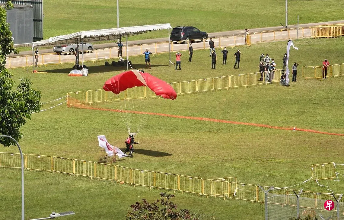 (早报讯)新加坡武装部队红狮跳伞队今天(7月15日)在碧山一带进行试跳时,其中一名跳伞员不慎“硬着陆”,送往医院救治。