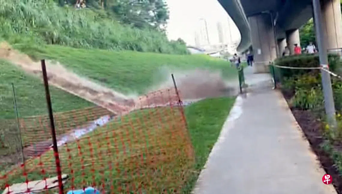 昨日(7月15日)傍晚接近7时,好景园(Goodview Gardens)第383座附近发生一起沟渠泥水急冲下坡事件。暴涨的沟渠泥水从好景园附近的下坡沟渠涌出,溢满了位于斜坡下端的武吉巴督西5道马路,两个通往好景园的车道因此暂停通行,被封锁数小时。