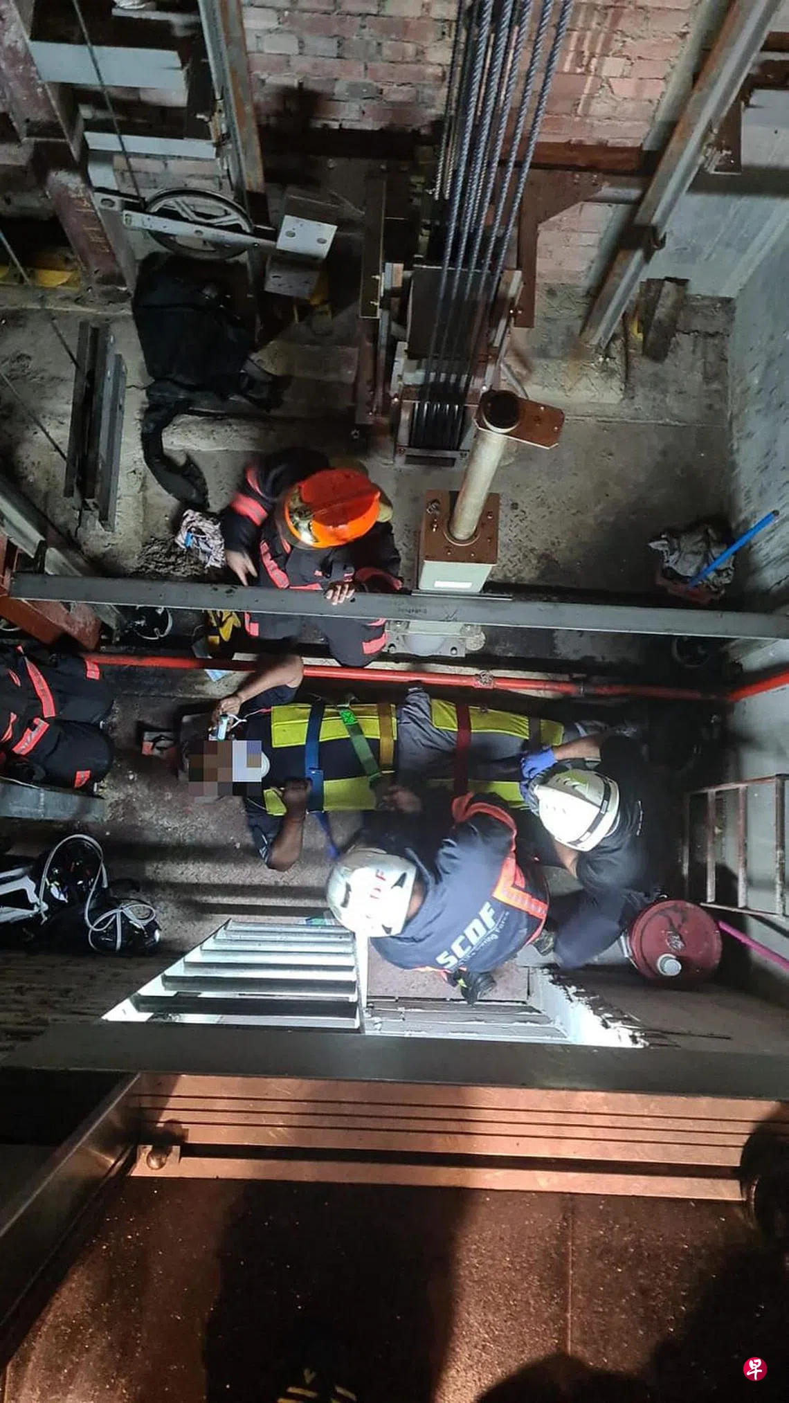 电梯维修员负伤困电梯井底部,民防部队以吊架系统救人,将维修员紧急送院。