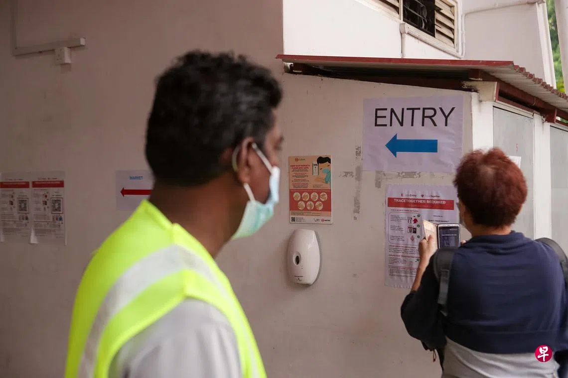 (早报讯)进入出现确诊病例的巴刹必须使用SafeEntry登记,人潮锐减一半,有访客先确定摊贩已经完成检测才进入巴刹买菜。