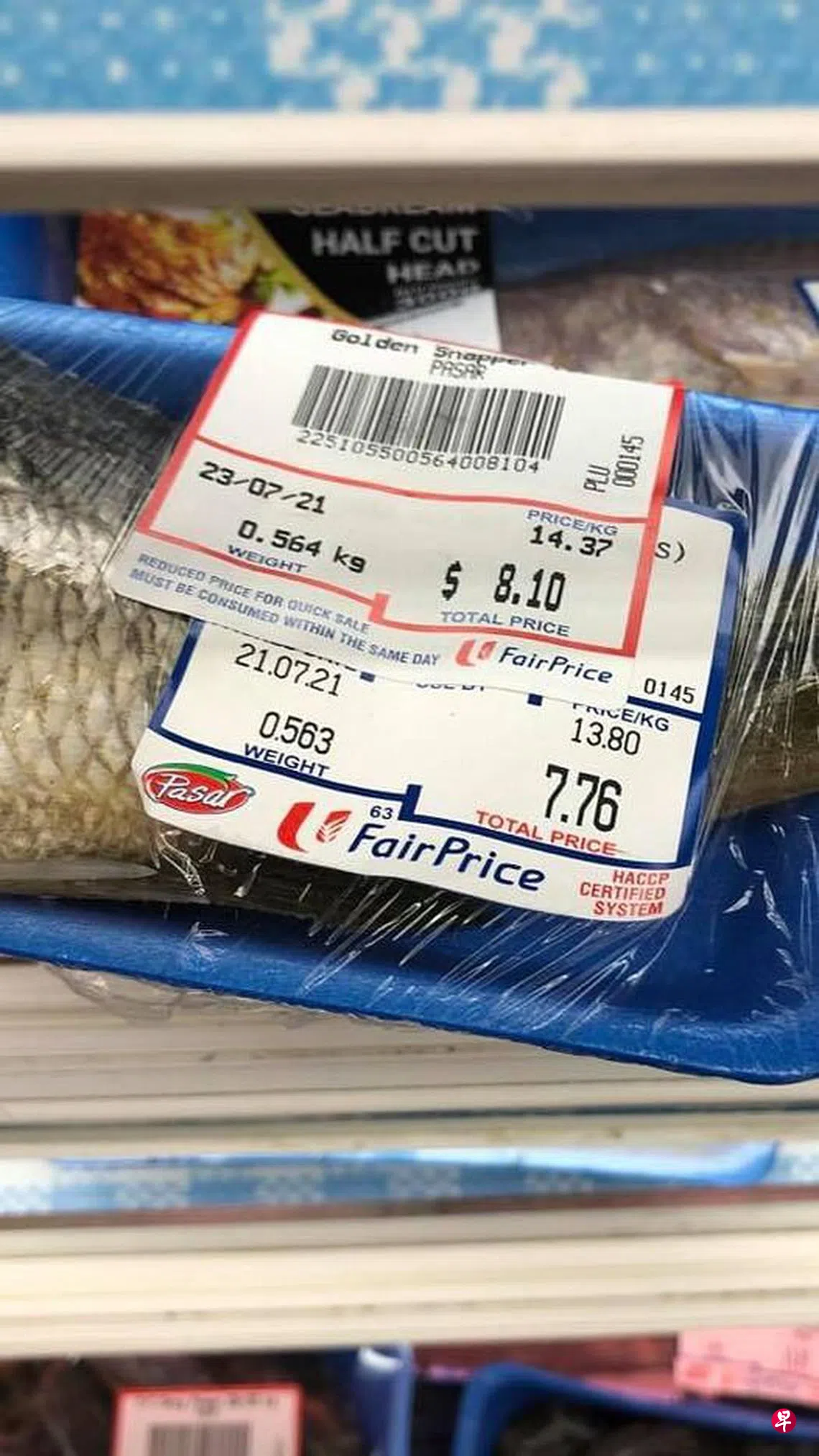 一名网友上周五(23日)在一个面簿群组上传一张照片,显示她当天在一家职总平价超市购物时,发现一包写着是金槽鱼(golden snapper)的产品,减价促销红色标签注明是8.10元,然而同一包装上的另一张蓝色正常价格标签上写的是7.76元。
