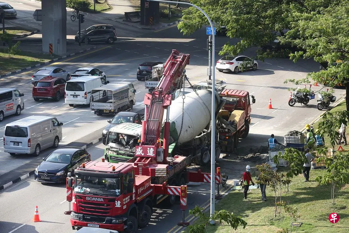 《联合晚报》热线读者路过事发地点时目睹一辆水泥车在该路段侧翻,记者之后走访现场了解情况,看见出事的水泥车已经被吊车吊了起来停在路旁。