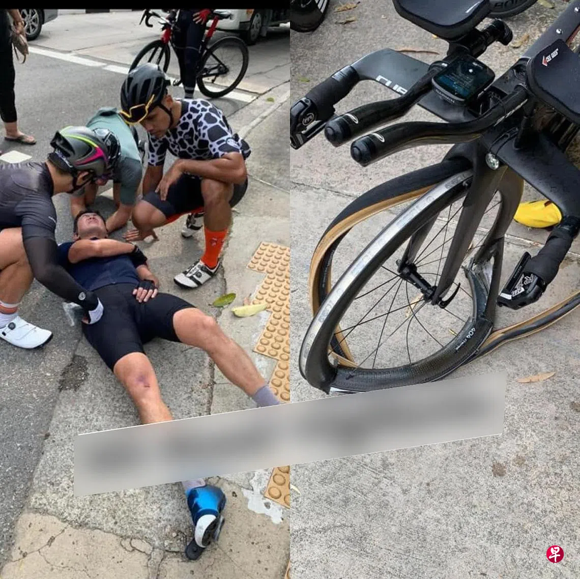一般相信,司机浑然不觉已撞上骑士,继续往前行,将骑士拖行了约三米远。 上传开的多则视频及照片显示,倾斗车离开后,骑士倒卧在地,右手捂住左肩,脸上露出疼痛的表情。另两名脚踏车骑士也停下帮忙。涉事的脚踏车则被撞得轮胎扭曲变形,可见撞击力之大。