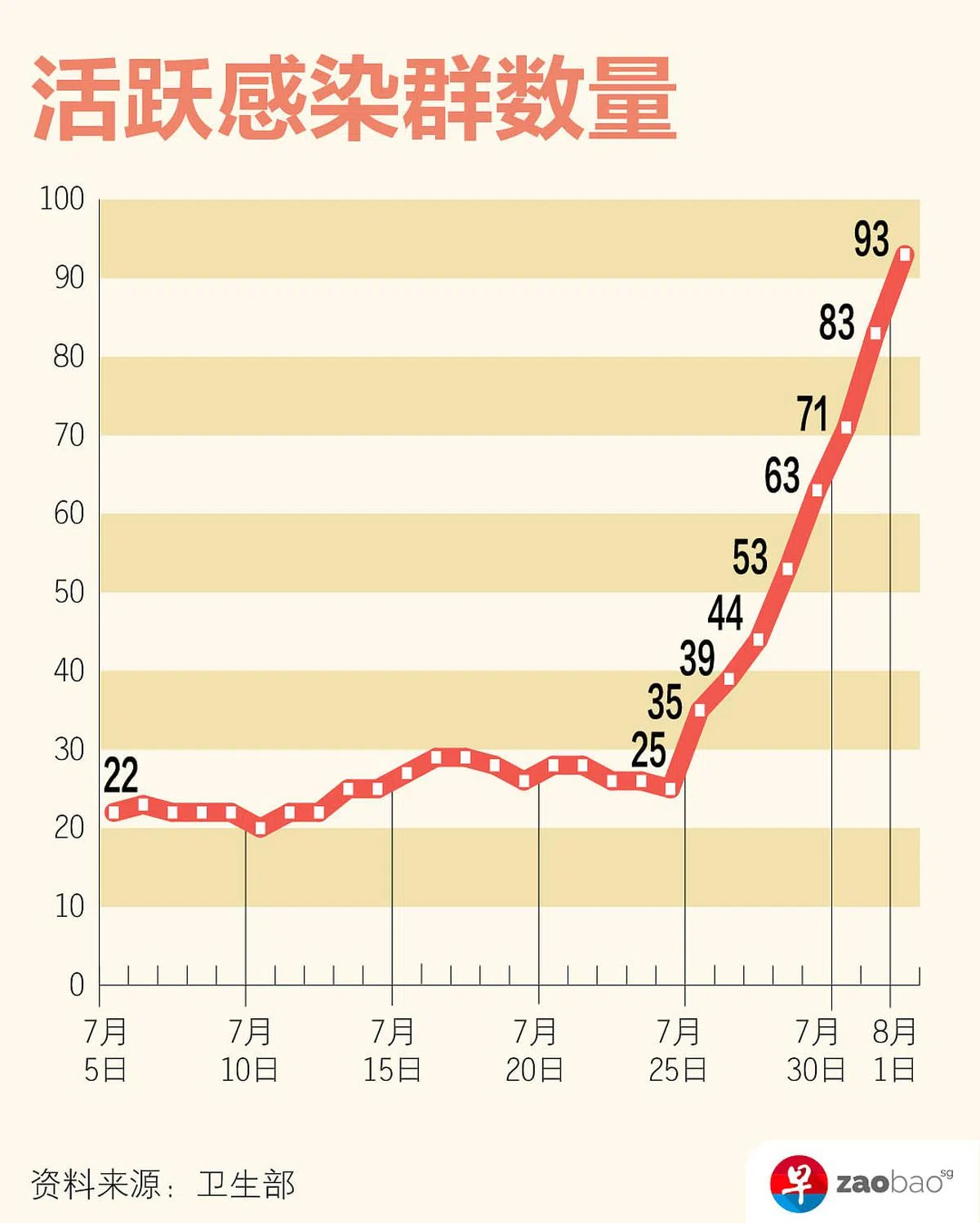自7月23日以来,本地每天都出现新的感染群,过去11天一共增加了74个,其中有五天还各增加10个,这些感染群个别都只有几个病例;在这期间,有14个感染群因为过去28天两轮病毒潜伏期未出现新病例,而脱离感染群名单。