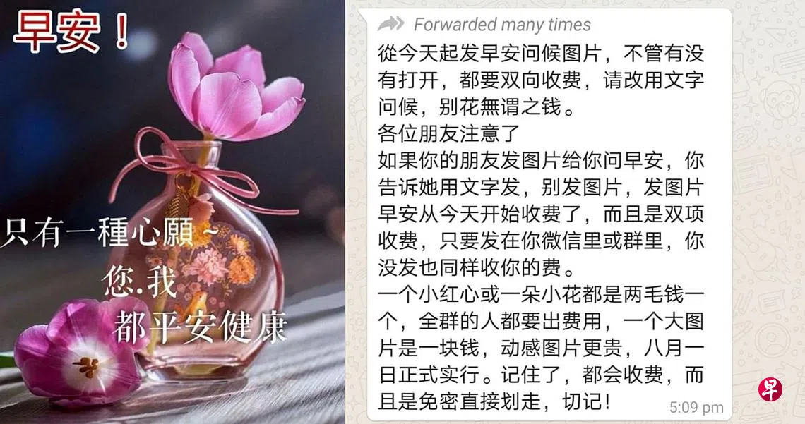 近日在WhatsApp上流传一条消息,指从8月1日开始,若发早安问候图片,就要双向收费,让公众日后改用文字发问侯。该消息被多次转发,内容还称不同类型的图片收费不同,若发在微信或群里,群组的人都要付费。