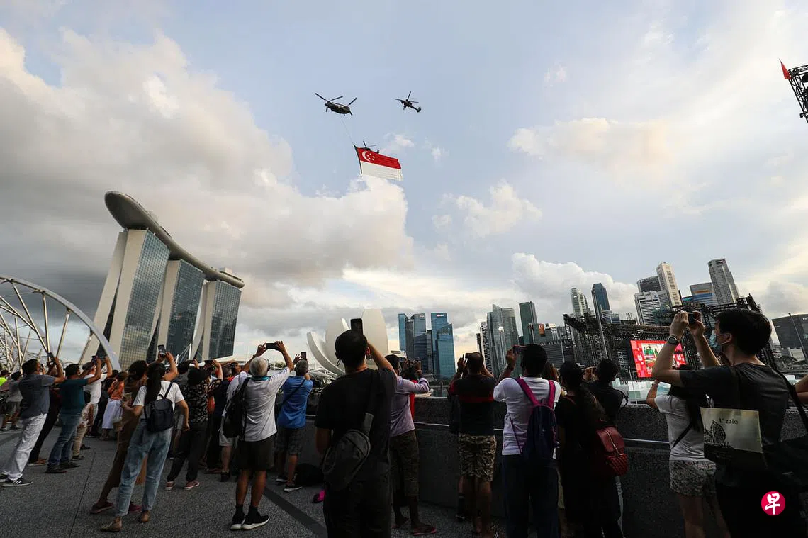 (早报讯)再过两天我国就庆祝56岁生日,8月9日早上,公众仍然可从9时50分起看到国旗致敬环节以及F-15SG战机飞过。但当天早上到滨海湾浮动舞台现场参与检阅礼的人数再减一半,仅剩600人。
