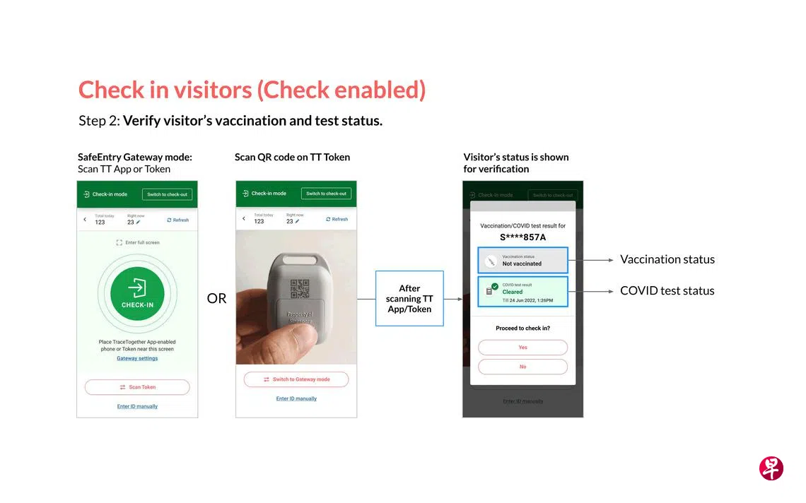 政府刚在SafeEntry网站上发布用户指南,指导业者如何设置程序让职员可通过访客的合力追踪手机应用或携手防疫器(TT token)来核查他们的接种状态。