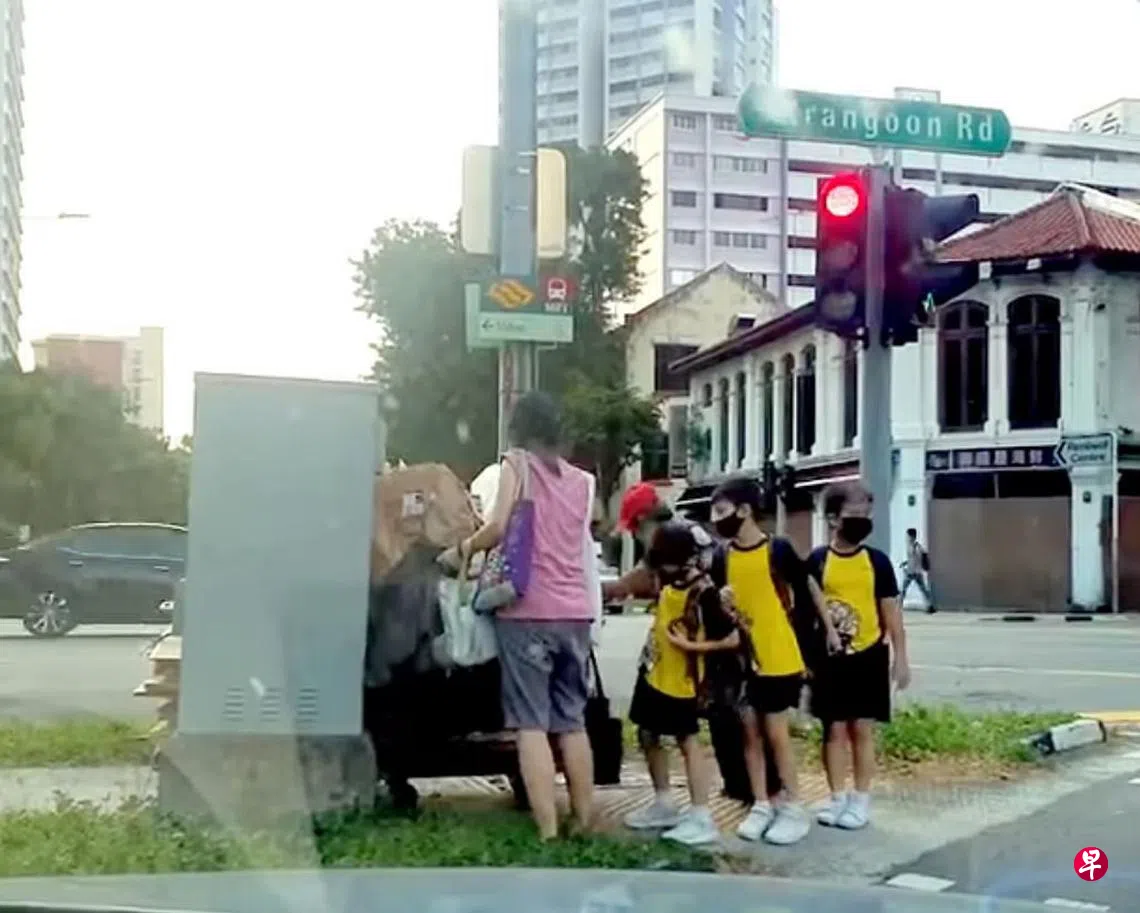 视频显示,一名戴着帽子的纸皮嬷正要将一推车的纸皮推过马路,但推车好像卡住,三名小学生正好出现帮忙,事后一名妇女也前来援助,并将掉落的纸皮捡起。