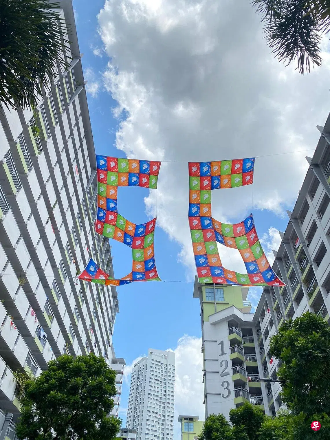 这个悬挂在大巴窑1巷第123和第125座组屋之间的超大幅装饰,顾名思义以“56”造型庆祝我国独立56年。负责这个大型装饰的团队,正是大巴窑景的居民。