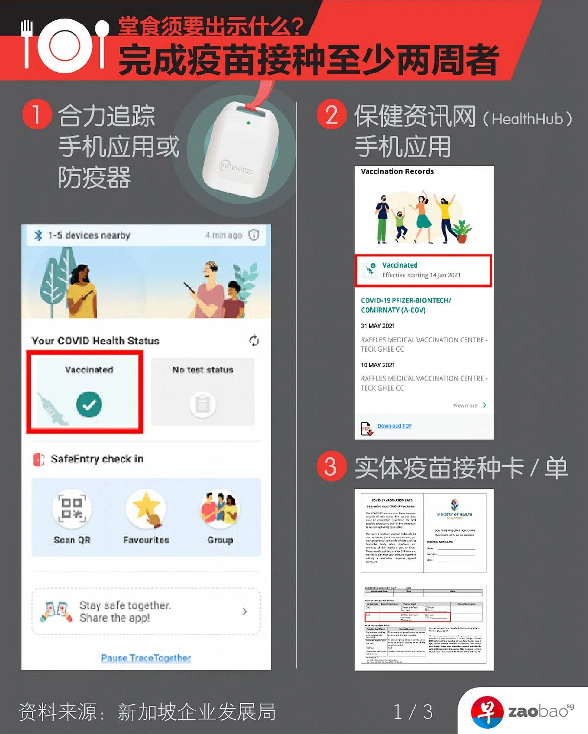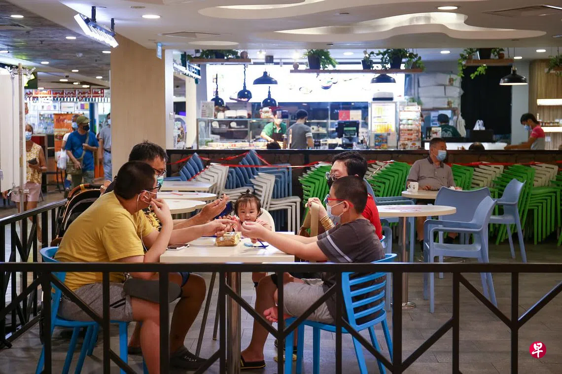 由于小贩中心和咖啡店的环境较为通风,所以食客无论是否已注射疫苗,都可两人同桌用餐。食阁和餐馆等其他餐饮场所则可以五人一桌,但只能接待已完成疫苗接种的顾客。