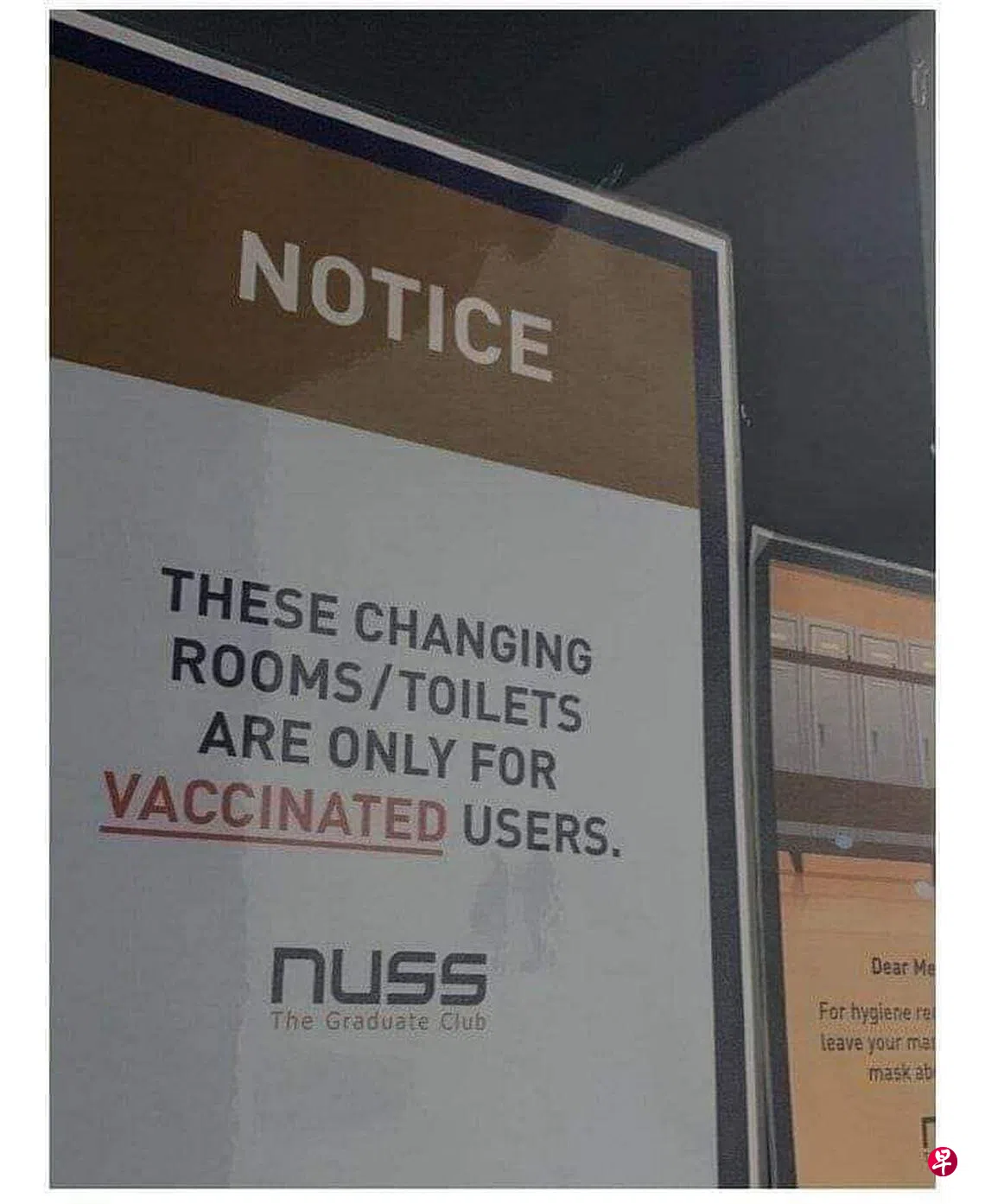一张新加坡国立大学协会(NUSS)的俱乐部厕所外所张贴的告示照片昨天在网上疯传,让人以为这里的厕所和更衣室只有接种过的人才能进入。但协会澄清,此举只是遵守体育理事会的指导原则,区分接种者和非接种者使用的厕所和更衣间。