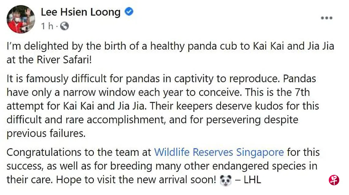 李显龙也在面簿贴文中说,自己期待与熊猫宝宝见面。